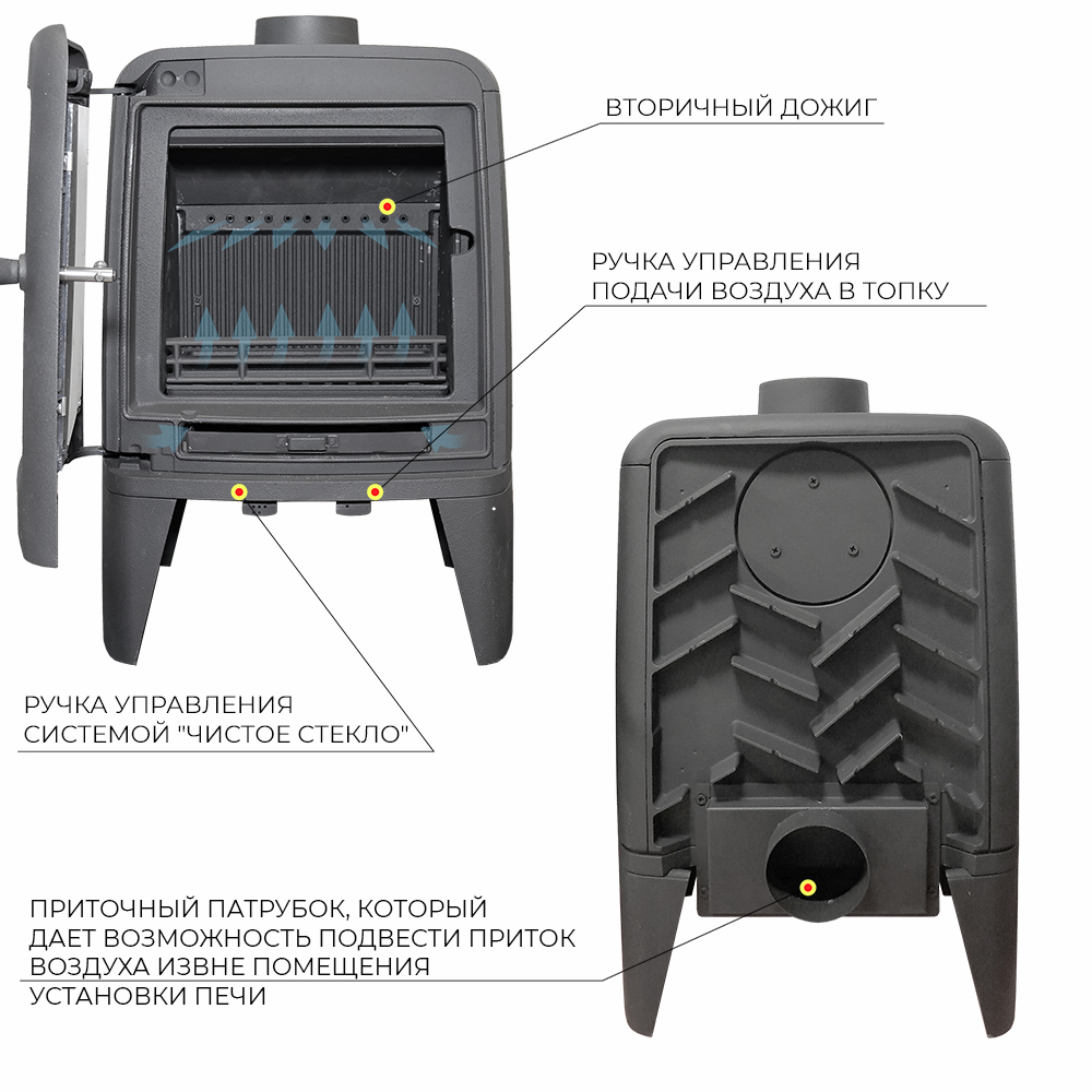 Печь-камин EVEREST М7 изготовлена из качественного жаростойкого чугуна с толщиной стенок 6-8 мм. Модель рассчитана на обогрев помещений объёмом до 140м³. Печь-камин имеет два пламегасителя: самый нагруженный пламегаситель изготовлен из чугуна, второй из стали 09Г2С. Топка печи-камина усилена чугунными плитами с системой двухуровневого вторичного дожига. С помощью этой функции по каналам подачи вторичного воздуха поступает воздух, который нагревается при прохождении между топочной камерой и стенками корпуса. Далее нагретый воздух через дефлектор поступает в топку, перемешивается с газами - продуктами горения, чем вызывает повторное возгорание. Регулировка этой системы, как и подача воздуха в систему чистое стекло, осуществляется заслонкой, расположенной слева в нижней части печи-камина. В правой нижней части расположена ручка регулировки подача воздуха в колосниковую зону. Патрубок дымохода Ø 120мм – универсальный, со сменным положением. Он может быть установлен сверху или сзади в зависимости от размещения печи в помещении. На задней стенке расположен приточный патрубок, который дает возможность подвести приток воздуха вне комнаты.