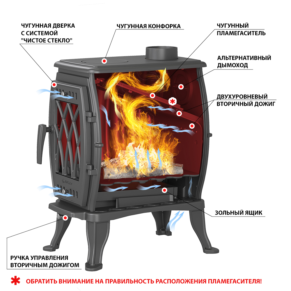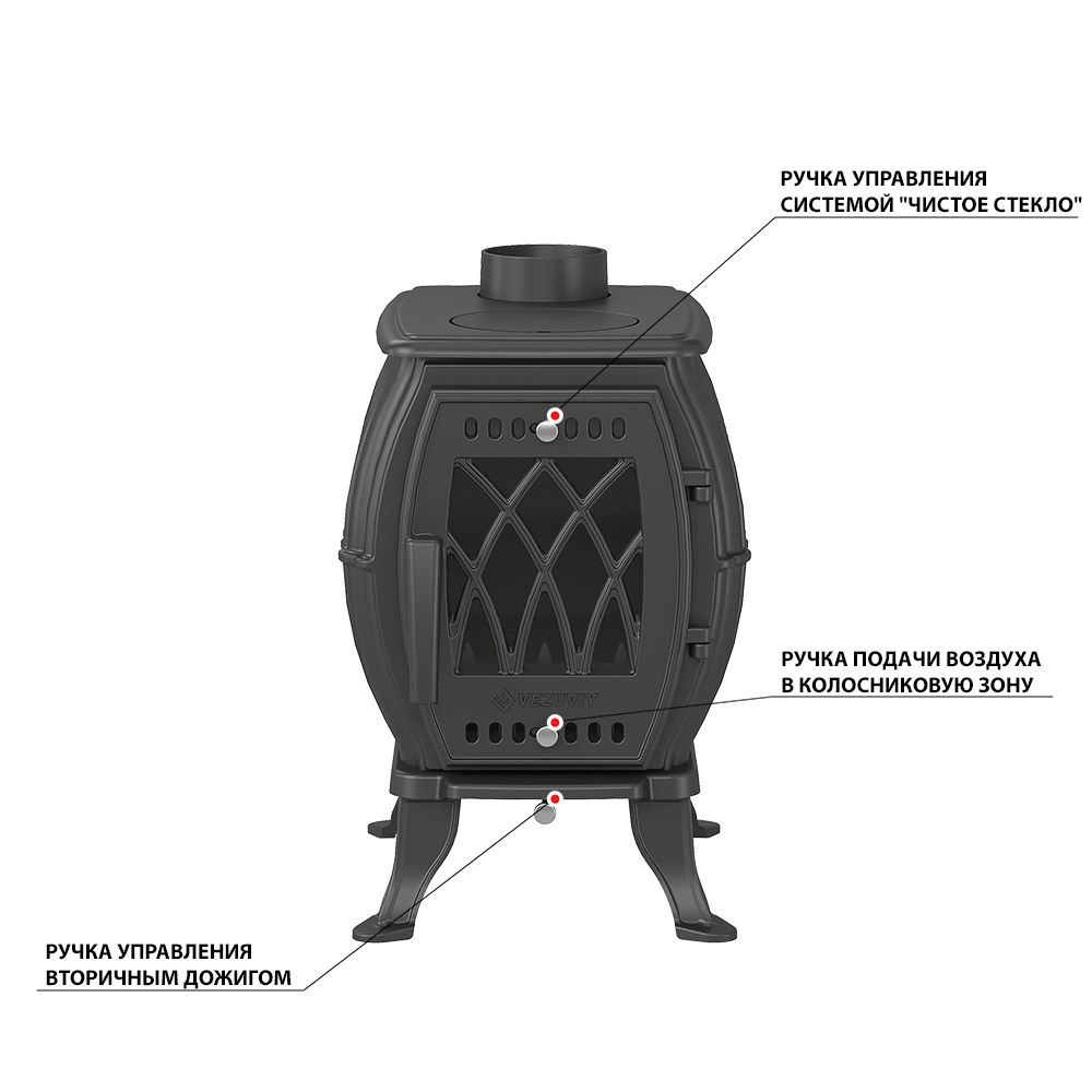 Печь-камин Везувий ВХ-05 "Антрацит" изготовлена из качественного жаростойкого чугуна с толщиной стенок 6-8 мм. Модель рассчитана на обогрев помещений объёмом до 100 м³. Печь-камин имеет пламегаситель изготовлен из чугуна. В Топки печи-камина установлена система двухуровневого вторичного дожига. С помощью этой функции по специальному каналу поступает воздух, который нагревается при прохождении между топочной камерой и задней стенкой корпуса. Далее нагретый воздух через дефлектор поступает в топку, перемешивается с газами - продуктами горения, чем вызывает повторное возгорание. Регулировка этой системы, осуществляется заслонкой, расположенной в нижней части печи-камина. Регулировка подачи воздуха в колосниковую зону осуществляется заслонкой, расположенной в нижней части двери. В верхней части двери расположена ручка регулировки системы чистое стекло, которая помогает оставаться стеклу чистым. Патрубок дымохода Ø 120 мм – универсальный, со сменным положением.